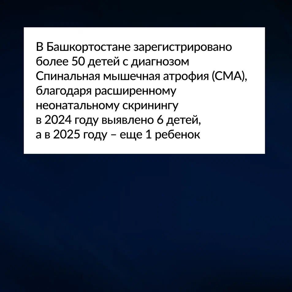 В Башкортостане зарегистрировано более 50 детей с диагнозом СМА. Благодаря расширенному неонатальному скринингу, в 2024 году выявлено 6 детей, а в 2025 году – еще 1 ребенок.