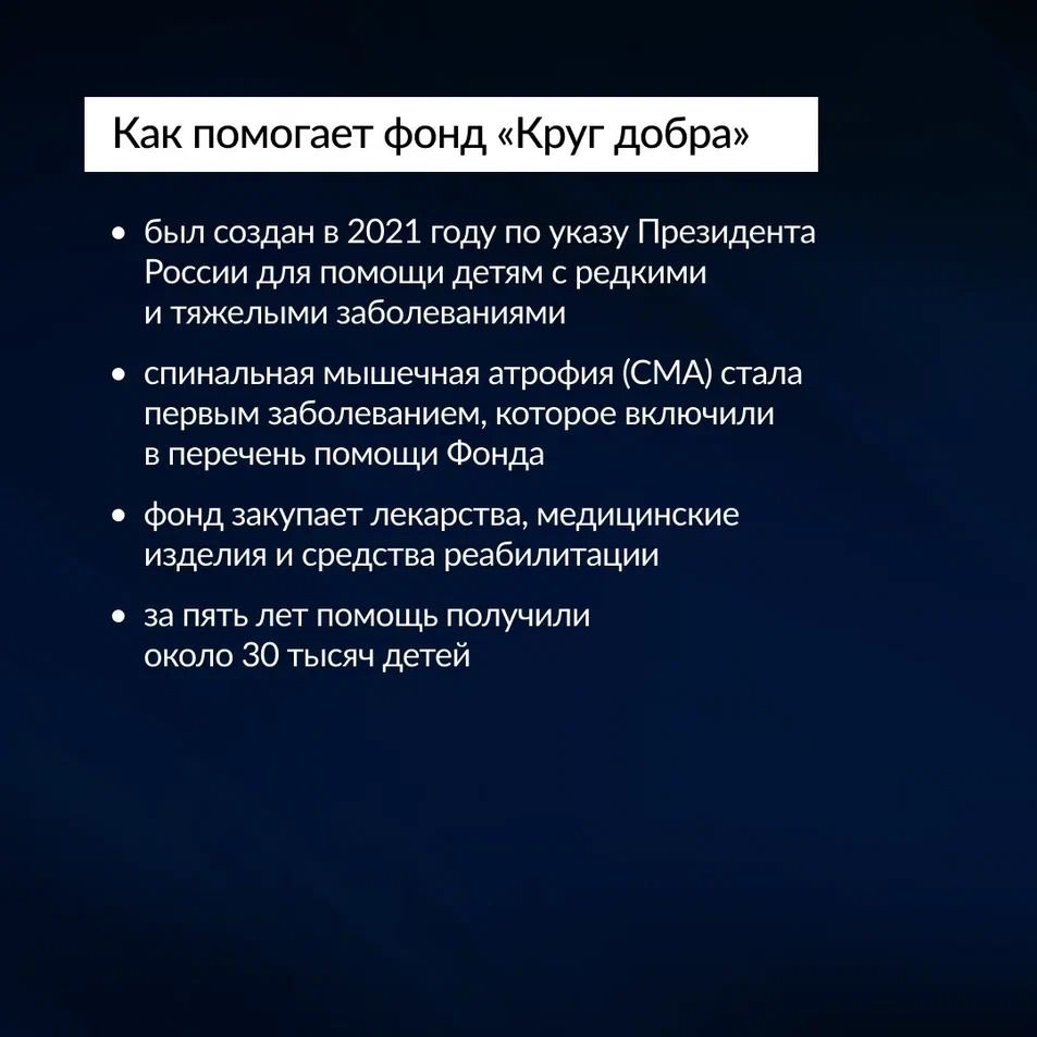 Благодаря фонду «Круг добра», который был создан в 2021 году по указу Президента России, всем детям с этим заболеванием в нашей стране по назначению врачей доступны препараты патогенетической терапии.
